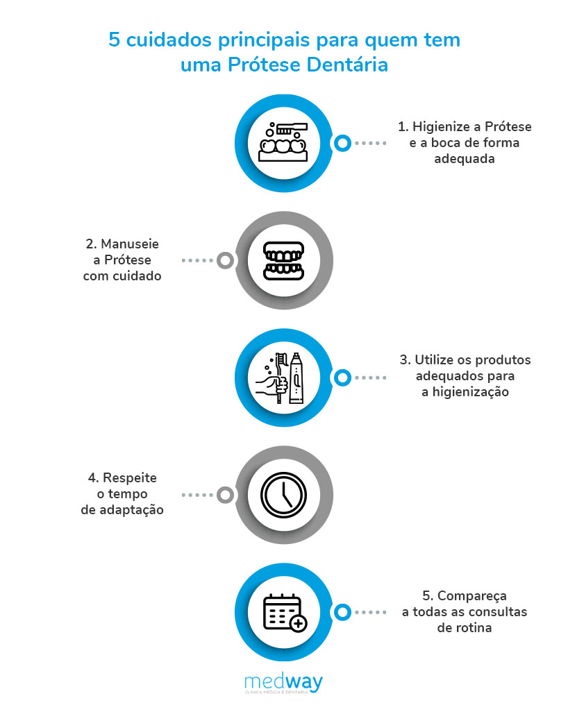 Quando colocadas, as Próteses funcionam como dentes naturais. Isto significa que também elas podem acumular fungos, placa bacteriana ou resíduos alimentares, resultando na deterioração da saúde oral. Então, após a colocação, os hábitos de higienização, como a escovagem, devem ser mantidos ou até melhorados, dependendo dos casos.